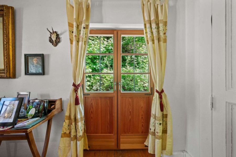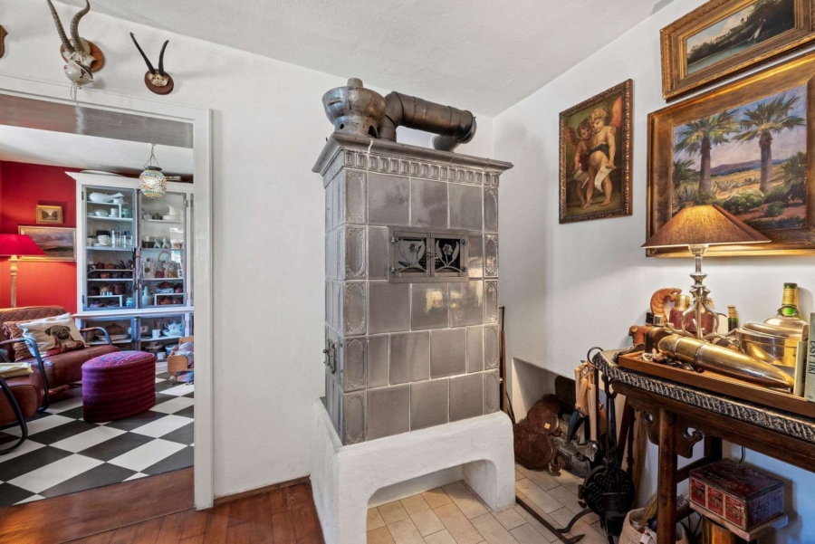 Die original alten Außenwände mit gut einem halben Meter dicke, die tiefen Fensterleibungen mit Sprossenfenstern aus Holz und der antike Kachelofen aus 1907 versprühen den typischen warmen Charm eines Bauernhauses. Der große Flur und die Küche sind im Rautenmuster gefliest, in den Wohnräumen wurden die alten Holzdielen neu aufbereitet.