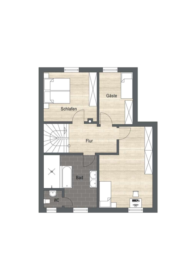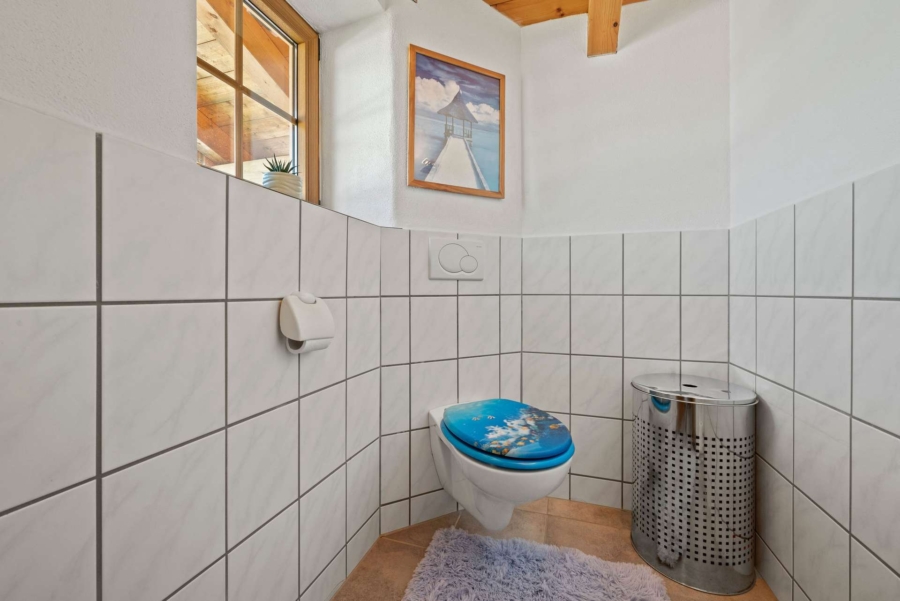 Im Obergeschoss befinden sich die Schlafräume, das großzügige Tageslichtbadezimmer mit bodenebener Dusche und einem Fester sowie das separate Gäste-WC. Vom Balkon hat man einen herrlichen Weit- und Bergblick. Alle Räume außer der Keller sind mit Fußbodenheizung ausgestattet. Besonders hervorzuheben ist die Höhe der Räume im Dachgeschoss. Hier schafft der Sichtdachstuhl eine besondere Atmosphäre.