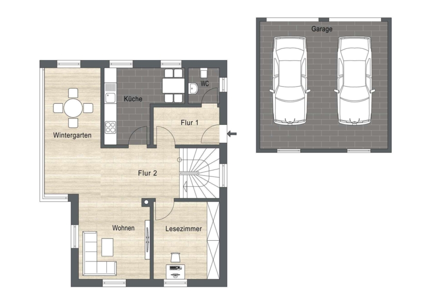 Über den geschützten Eingangsbereich, ist Garage und Haus auf geniale Weise miteinander verbindet, betritt man das Haus bei Regen und Schnee im Trockenen. Die ca.140 m² Wohnfläche verteilt sich auf zwei großzügige Ebenen. Im Erdgeschoss ist eine großzügige Garderobe mit anschießendem Gäste-WC. Die Küche bietet Platz für einen gemütlichen Esstisch und der offengehaltene Wohnbereich mit großzügiger Fensterfront und Zugang zur Terrasse und Garten. Ein Schwedenofen im Wohnbereich sorgt auch in der Übergangszeit für Gemütlichkeit und Wohlbefinden.