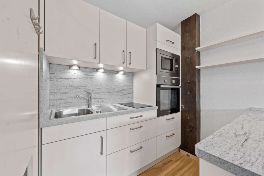 Eine gemütliche Wohnküche mit Zugang zum sonnigen Balkon