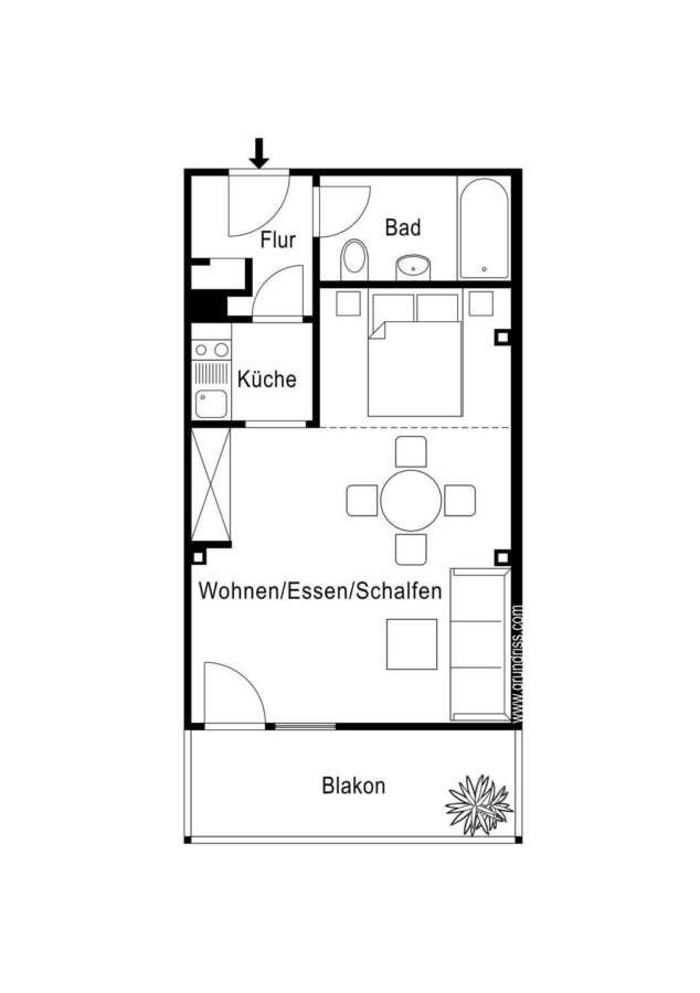 Das 1/1,5-Zimmer-Appartement hat eine Wohnfläche von ca. 42 m². Es wurde ca. im Jahre 1974 erbaut. Eine Teilung nach WEG liegt seit 1984 vor. Jede Wohnung verfügt über eine eigene Gasthermenheizung. Zum Appartement gehört ein großzügiger Wohnraum mit einer Schlafnische, ein Bad mit Wanne und Tageslicht, eine kleine Küche. Erweitert wird der Wohnraum