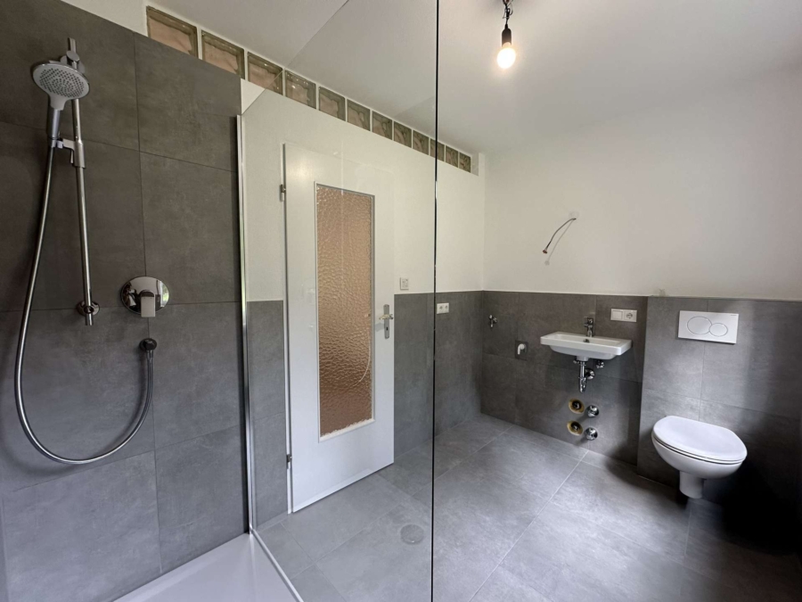Das Schlafzimmer dient als Durchgangsraum zum Tageslichtbad, das mit Dusche und Fenster ausgestattet ist. Hier befindet sich zudem der Anschluss für die Waschmaschine.