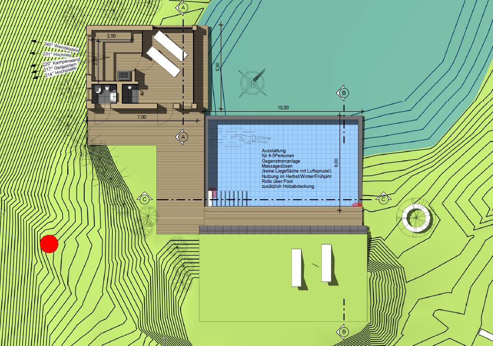 Im parkähnlichen Garten des stattlichen Anwesens durften wir die Planung des exklusiven Pools mit integriertem Saunagebäude übernommen. Die Lage auf einer Anhöhe ermöglicht (auch aus der Sauna) einen herrlichen Panoramablick über die Chiemgauer Alpenkette.